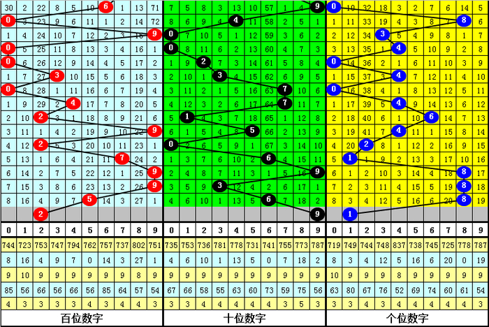 在第096期历史同期开奖中,号码0-9出现频次从高到低分别为:号码9→9次;号码4、7→8次;号码1、2、3、5→6次;号码0、8→5次;号码6→4次。一般来说,表现最热的号码:479+1235中至少出现1个奖号。同时奖号不会全部出现在表现最冷的号码中。